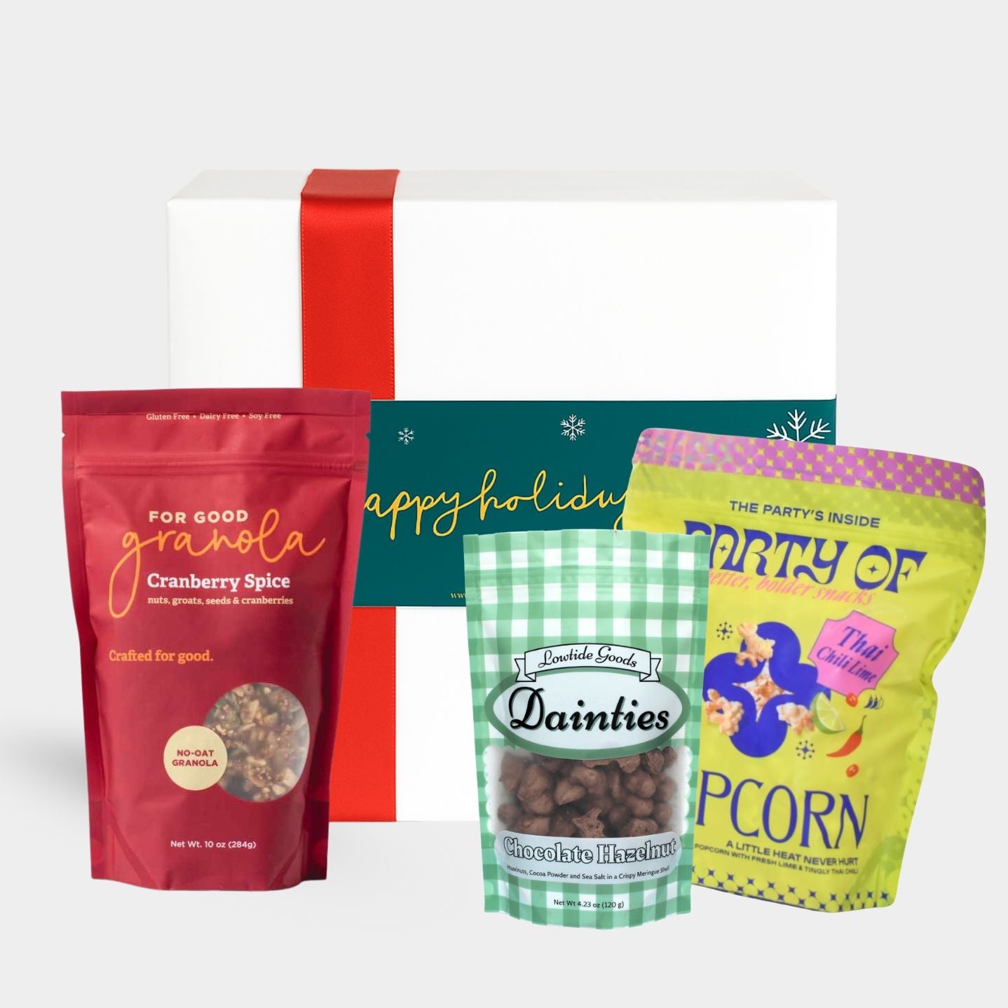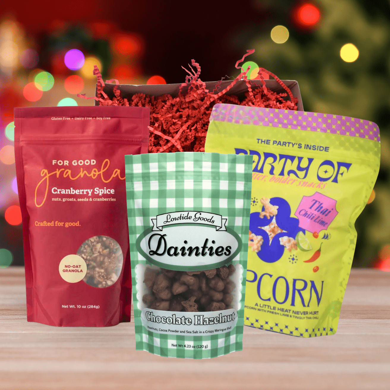 Celebrating bold flavors and even bolder women. This thoughtfully curated trio brings together sweet, savory, and spice-forward bites—cranberry granola, zesty Pad Thai popcorn, and delicate hazelnut treats—each crafted by female-founded brands making their mark on the culinary world. Taste the passion, one bite at a time.