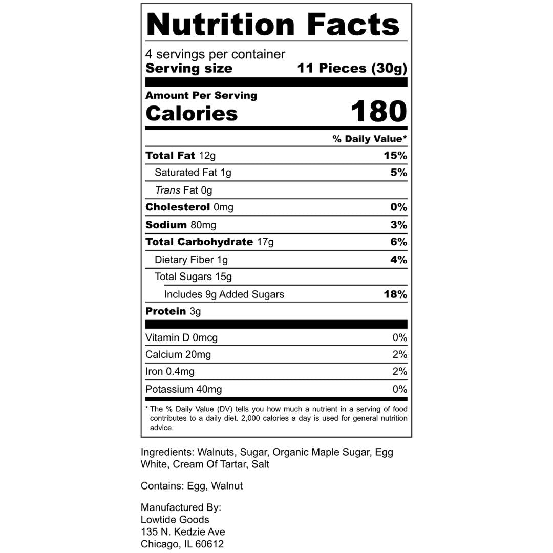 Ingredients: Walnuts, Organic Maple Sugar, Egg Whites, Salt, Cream of Tartar