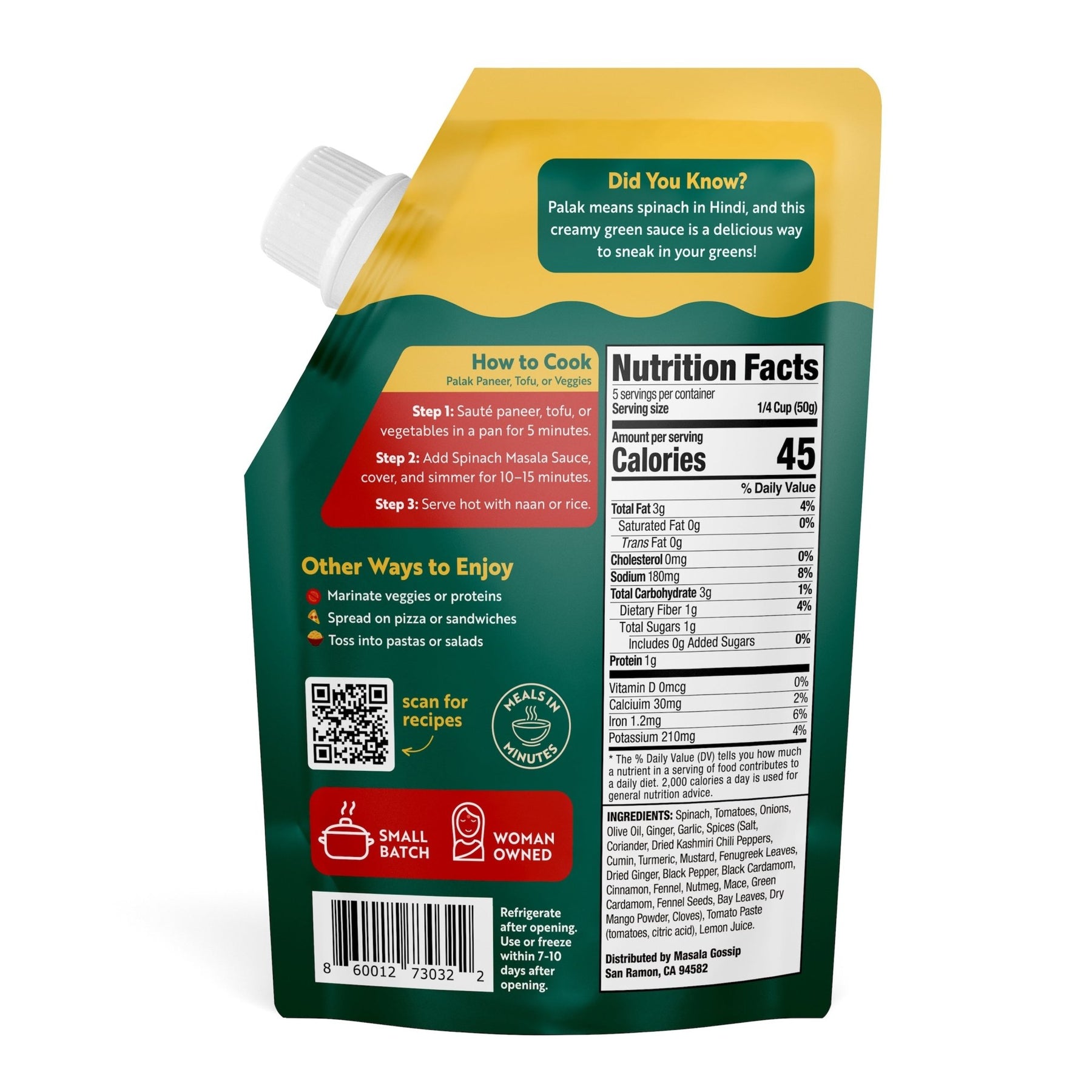 Ingredients: Spinach, Tomatoes, Onions, Olive Oil, Ginger, Garlic, Spices (Salt, Coriander, Dried Kashmiri Chili Peppers, Cumin, Turmeric, Mustard, Fenugreek Leaves, Dried Ginger, Black Pepper, Black Cardamom, Cinnamon, Fennel, Nutmeg, Mace, Green Cardamom, Fennel Seeds, Bay Leaves, Dry Mango Powder, Cloves), Tomato Paste (tomatoes, citric acid), Lemon Juice