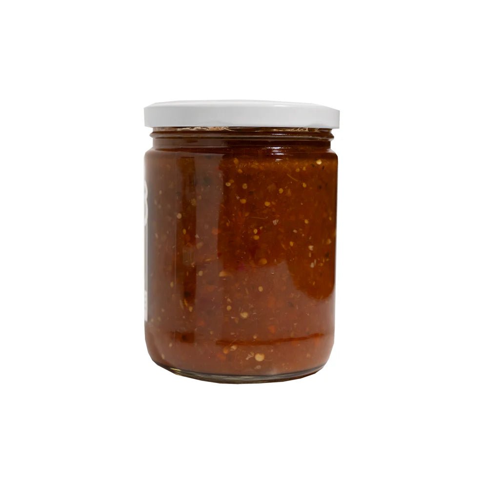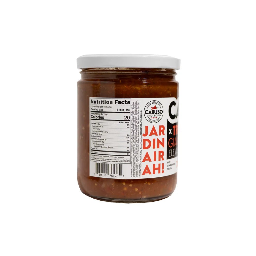 Ingredients: Tomatillos, Crushed Tomatoes (Tomatoes, Tomato Puree, Sea Salt, Citric Acid), Caruso’s Hot Giardiniera (Serrano Peppers, Red Bell Peppers, Jalapeno Peppers, Habanero Peppers, Celery, Cauliflower, Carrots, Water, Distilled Vinegar, Salt, Garlic Powder, Spices, and Preservatives [Sodium Benzoate, Calcium Chloride, Potassium Sorbate, Sodium Bisulfite]), Lime Juice (Filtered Water, Lime Juice Concentrate, Lime Oil, Less Than 1/10th of 1% Sodium Metabisulfite & Sodium Benzoate), Kosher Salt, Cilantro, Garlic, Soybean Oil