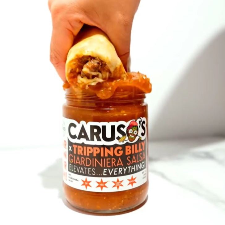 Caruso Provisions x Tripping Billy Mild Giardiniera Salsa is a collaboration with Chicago popup chef and muscular dystrophy advocate Billy "Tripping Billy" Zureikat.  It is made with the finest selection of tomatoes, peppers, vegetables, and spices, blended into a smooth and flavorful salsa.