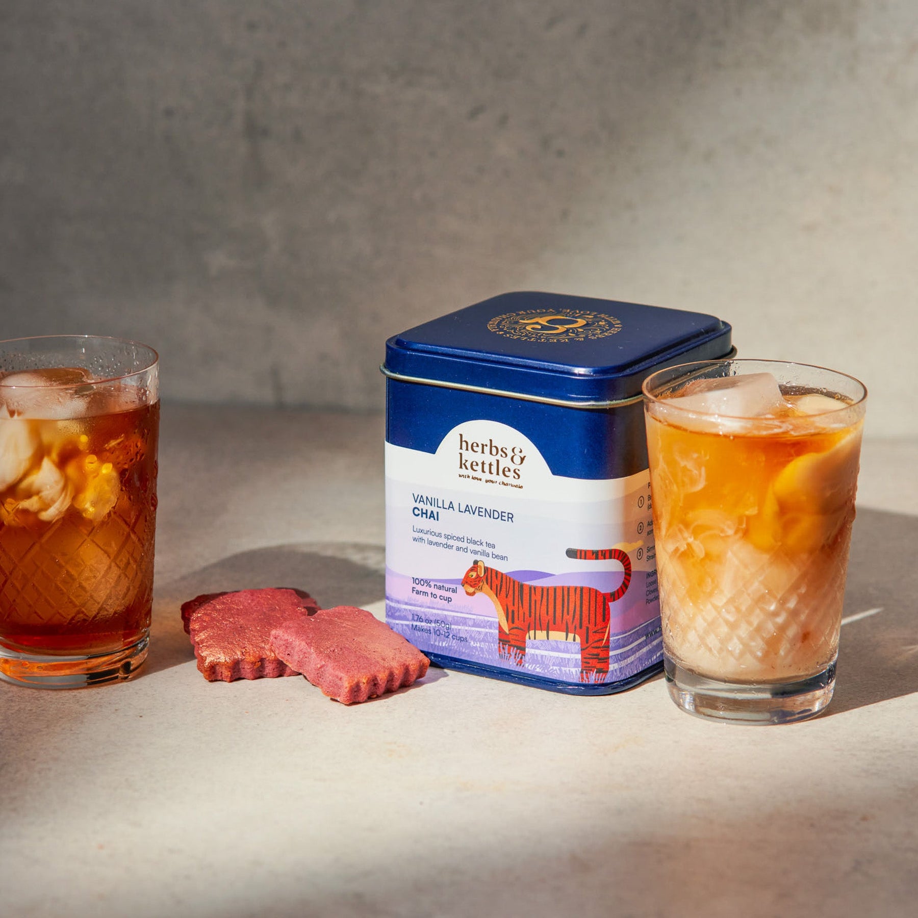 Herbs & Kettles Vanilla Lavender Chai features real vanilla bean and aromatic lavender flowers, perfectly blended with single-origin Assam black tea and chai spices. This luxurious and sublime blend offers an exquisite experience, whether enjoyed hot or iced. It's fabulous!